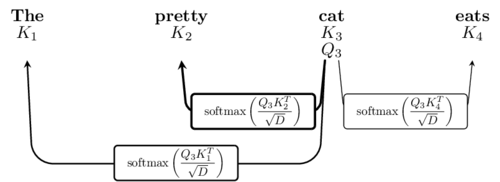 The query encodes another type of information about what types of keys would be useful for that particular token. In the case of query \(Q_3\) it is probably useful to attend to any adjective-like key that could show something interesting about the current word. Therefore, the quantity \(\text{softmax}\left( \dfrac{QK^{T}}{\sqrt{D}} \right)\) will be larger and will contribute more heavily in the resulting vector \(V’\). This is illustrated in the graph above with heavier edges.